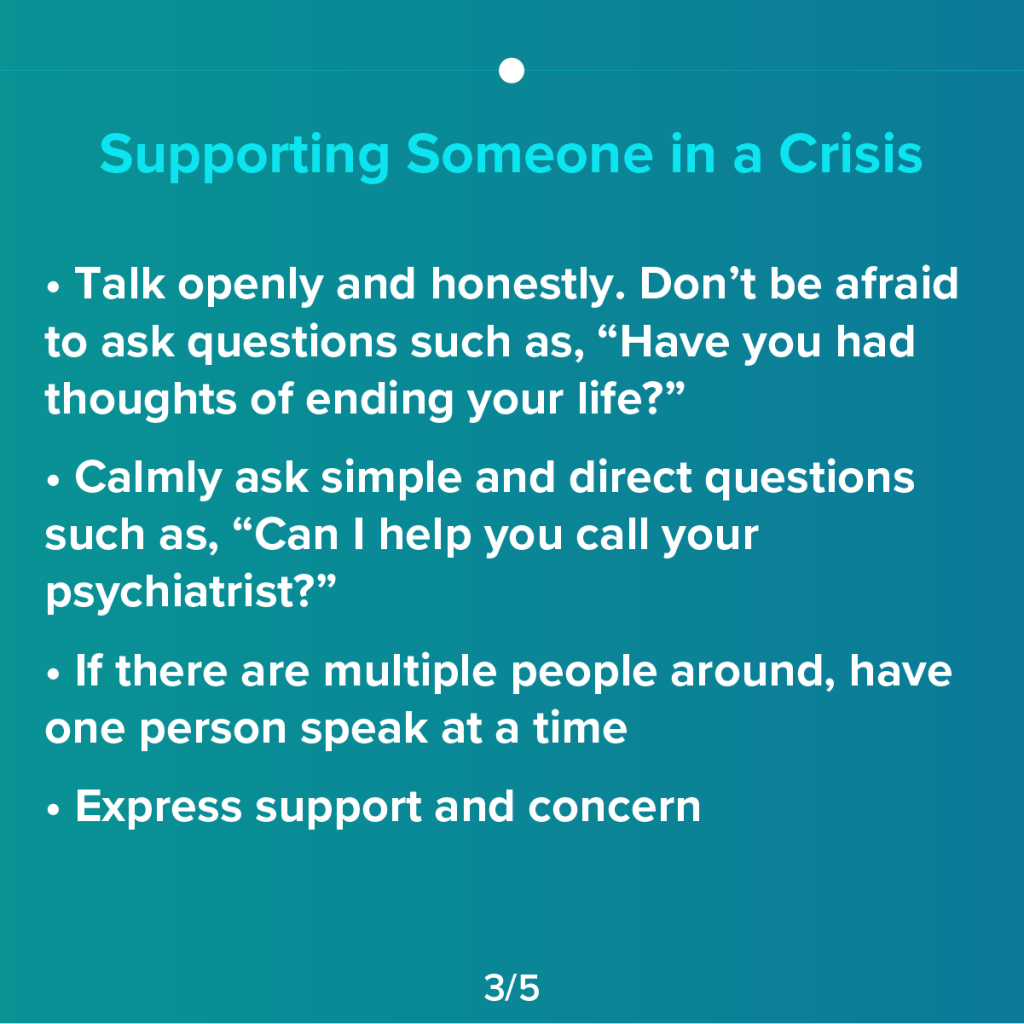 There’s a misconception that talking about suicidal thoughts and feelings might encourage someone to follow through with it; that the best response is to shut down the conversation (“don’t think like that”). But in my own experience, I was only able to ask for help from an adult when I was 15 because of the support of a friend.